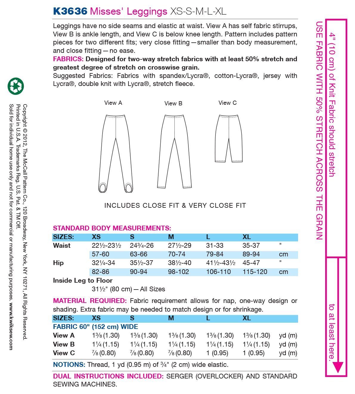 Amazon Com Kwik Sew K3636 Leggings Sewing Pattern Size Xs S M L Xl Arts Crafts Sewing